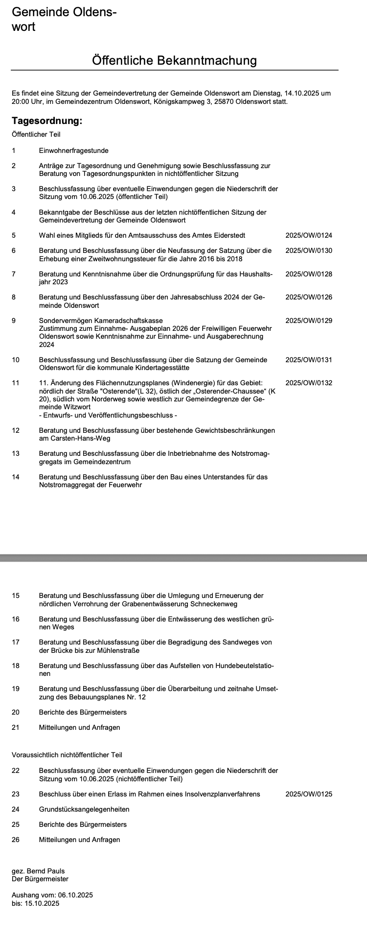 Aktuelles Neuigkeiten Oldenswort Sitzung der Gemeindevertretung Tagesordnung vergrößern Suche nach: Start Leben in Oldenswort Schule Unser Konzept Impressionen Betreuungsangebot Vertrag Schüleraufnahmebogen Anmeldung Schulvertrag Kontaktformular Privatschule Oldenswort Kirchengemeinde Gottesdienste und Veranstaltungen Vermietung Karkenhuus Broschüren Kontakt & Öffnungszeiten der Kirchengemeinde Ärzte & Gesundheit Handel und Gewerbe De Ole Backstuv Café blaublütig Eisenwaren Timm Landschlachterei Kühn Unse Koopmann Femkes Küstenschnitt Dachdeckerei Wolf & Ohls Ferienwohnungen Bus & Bahn Müllabfuhr-Termine Termine & Veranstaltungen Vereine Sportvereine TSV Oldenswort Sportangebot Aikido Fitness Fußball Spielplan 1. und 2. Herren Handball Jumping Fitness Rückenfitness Turnen Über Uns Förderverein Downloads Kontakt Externe Links Manns & Fruunsboßelvereen Impressionen Unterverband Landesfeldklootbosseln Spende Hospizdienst Eiderstedt Preisbosseln 2024 Landschaftsbosseln in Koldenbuettel Landesstrassenbosseln in NF Landespokalbosseln der Frauen Steinburg Landesfeldklootbosseln in NF Fahrradtour nach Garding EM in Ostfriesland Fahrradtour 2023 Fahradtouren 2020-2022 Weitere Fotos Veranstaltungen 2025 Feldkampftermine 2025 Verbandstermine 2025 Über uns Wie wird geboßelt? Boßel-ABC Boßel-Lied Kontaktdaten MANNS- & FRUUNSBOSSELVEREEN Externe Links Ringreitergilde Impressionen Termine Über uns Würdenträger Kontaktdaten Ortskulturring Förderverein Rehkitzrettung Vorstand Satzung Mithelfen & Beitritt Beitrittserklärung Kontakt Rehkitzrettung Weitere Vereine & Verbände Vor Ort Treffpunkt Oldenswort Café im Treffpunkt Oldenswort Galerie – Wechselnde Ausstellungen Ortsgeschichtliche Sammlung Museum – Dauerausstellung Geschichte des Hauses Dorfstaße 31 Chronik Oldenswort DeOldeWurt Sehenswürdigkeiten Fotos von Oldenswort Wichtige Adressen Kita Oldenswort Räumlichkeiten im Überblick Kita-Gruppenräume Mitarbeiter*innen Projekte Kita-ABC Öffnungszeiten Formulare und Dokumente Förderverein Träger Hort Hort Anmeldedokumente Feuerwehr Jugendfeuerwehr Fahrzeuge Mitglied werden Gemeinde Verwaltung Gemeindevertretung Baugebiete Protokolle Sitzungstermine Stellenangebote
